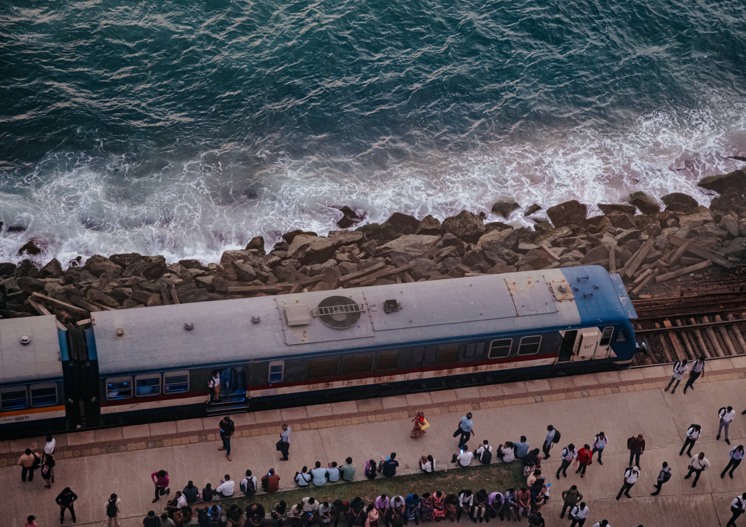 As the train pulls into the station, waves crash relentlessly on one side while passengers gather quietly on the other, waiting for the ride home. The image holds a tension between chaos and stillness — between nature and machine, and between those who have and those who do not.