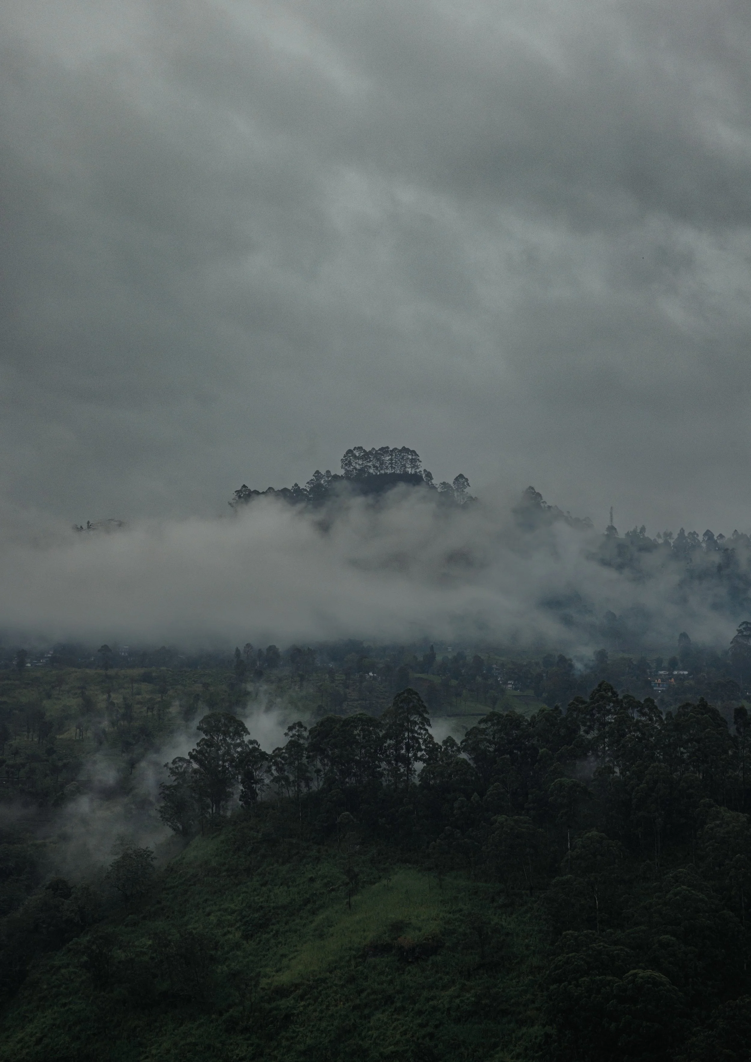 Low clouds drift across the hillside, revealing and concealing the landscape in slow rhythm. The image captures a moment of quiet transition — where distance softens, sound fades, and the land feels suspended between presence and absence.