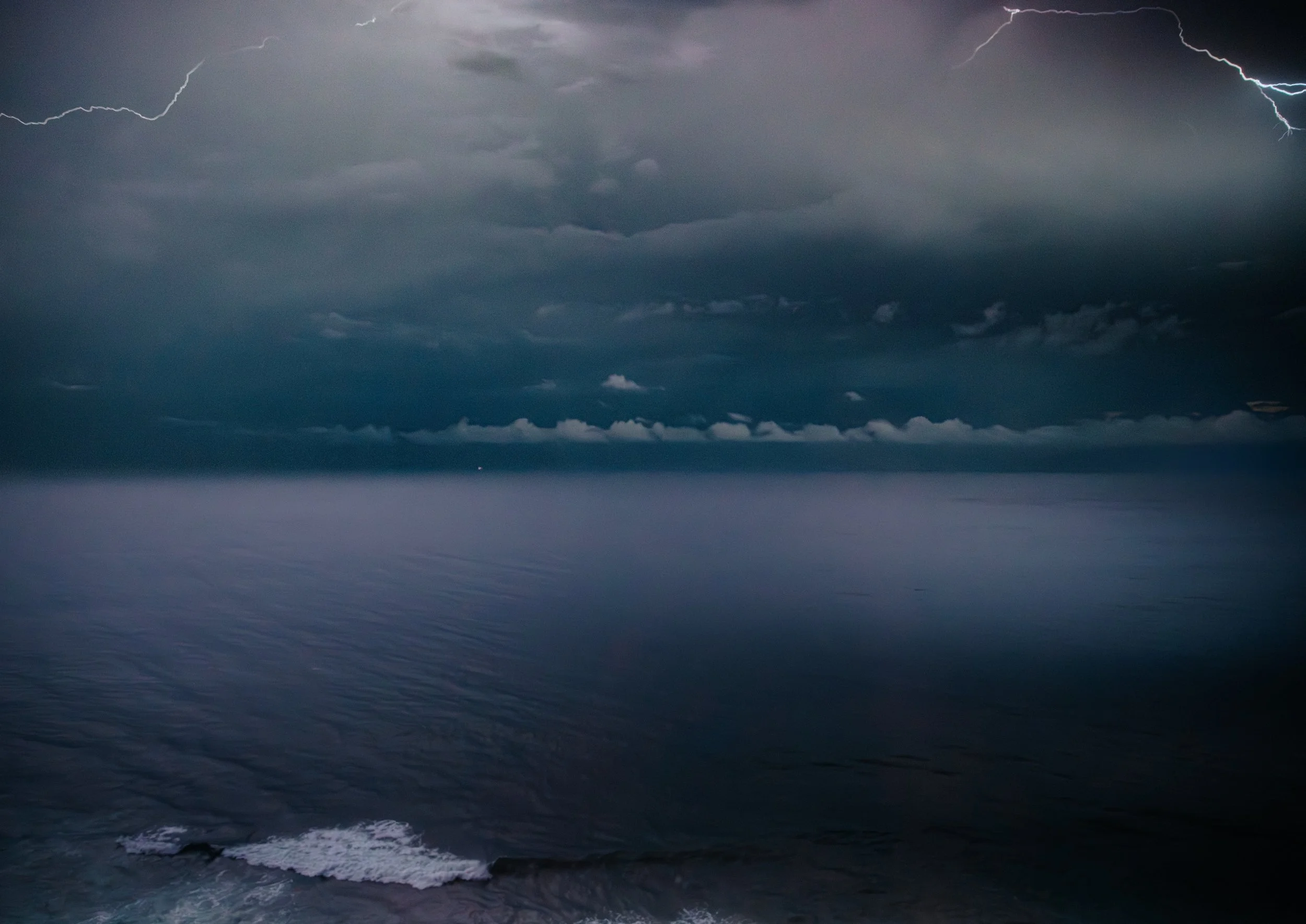 Above a rough sea, dual lightning strikes split the sky, briefly illuminating the chaos below. The image captures a fleeting moment of raw energy — where power, movement, and uncertainty collide in a single frame