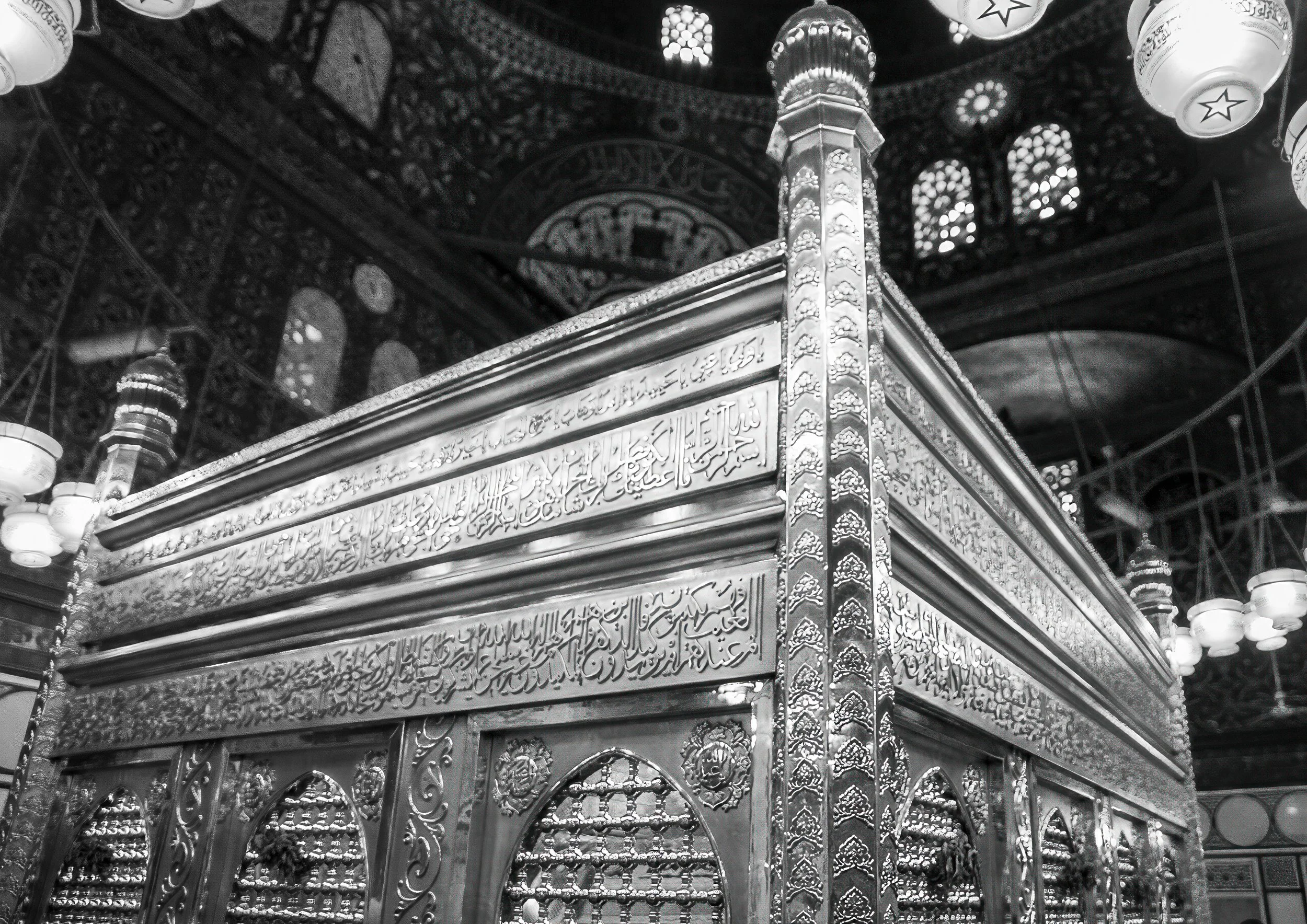 The corner of the shrine emerges softly into view, illuminated by the glow of lights above. Framed by shadow and detail, the image captures a quiet reverence — a moment where devotion, architecture, and atmosphere meet.